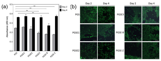 The cytocompatibility of PGS, PGSE1, PGSE2, PGSE3, PGSE-B, and PGSE-Z is shown in Figure 9. On day two, the viability of the cells cultured with PGSE3, PGES-B, and PGSE-Z was less than that of PGS. The reduced cytocompatibility may be attributed to unreacted L-glutamic acid, Boc-L-glutamic acid, or Z-L-glutamic acid that could be leached into the medium during the test. The molar ratio of the reactants tested in this study might not be ideal, which could lead to soluble portion of the elastomers. Nevertheless, unreacted L-glutamic acid could be leached from PGSE before its use. Interestingly, the viability of the cells cultured with PGSE3 and PGSE-Z returned to the level comparable to that of PGS on day four. The immunofluorescence images stained for GAPDH suggest that culturing with the materials did not affect cell morphology.