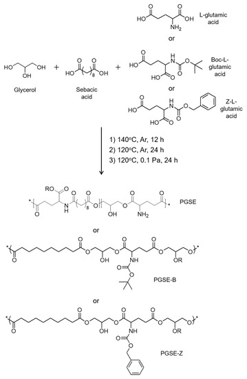 Glycerol, dimethyl sulfoxide-d6 (DMSO-d6) and tetramethylsilane were purchased from Sigma-Aldrich (St. Louis, MO, USA). Sebacic acid was purchased from ACROS (St. Louis, MO, USA). L-glutamic acid was purchased from Alfa Aesar (Ward Hill, MA, USA). Boc-L-glutamic acid and Z-L-glutamic acid were purchased from Bachem (Bubendorf, Switzerland). Acetone andtetrahydrofuran (THF) were purchased from Macron (Center Valley, PA, USA). For cell culture, Dulbecco’s modified Eagle’s medium (DMEM), penicillin/streptomycin, and trypsin-EDTA were obtained from Thermo Fisher Scientific (Waltham, MA, USA) and calf serum was purchased from Hyclone (Logan, UT, USA). WST-8 assay was purchased from Abbkine (Wuhan, China). All chemicals were used as received without further purification.