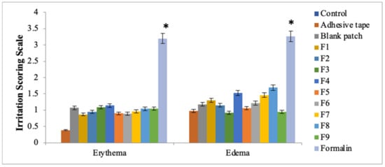 All the prepared transdermal patch formulations were carried out for skin irritancy potential. The prepared patches showed no skin irritancy as compared to the standard irritant formalin (Figure 7). The formalin produces severe erythema and edema. The study resulted that the formulated patches (F1–F9) were non-irritant to the skin and were suitable candidates for use in transdermal applications. Moreover, the additions of various penetration enhancers (Eucalyptus oil, N-methyl-2-pyrrolidone and Oleic acid) in various concentrations have no contribution towards erythema or edema. Draize patch test was used for evaluating skin irritation potential of the prepared patches. In the case of all patches, the values obtained were below 2, which indicates that prepared patches were safe to be used tropically.