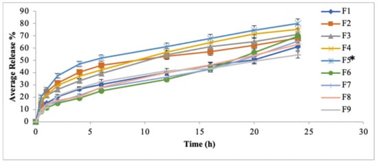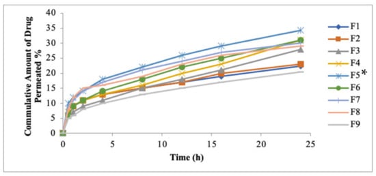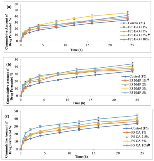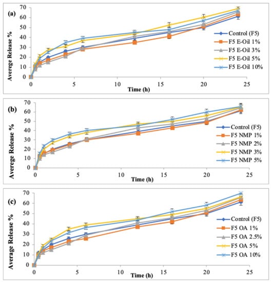 However, an increase in average release (%) along with an increase in the concentration of penetration enhancers were found, as showed in Figure 8a–c. The formulation F5 (control) exhibited 61.23% drug release in 24 h. The formulation containing different penetrations at different concentrations exhibited insignificant difference in drug release (p > 0.05). However, a slight increase was found with various concentrations of penetration enhancers. The 5% concentration of Eucalyptus oil exhibited 68.99% drug release, 5% N-methyl-2-pyrrilidone concentration exhibited 65.98% and 10% Oleic acid exhibited 69.77 drug releases.