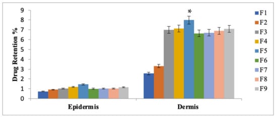 The formulated patches were carried out for skin drug retention studies (Figure 10). Skin drug retention was carried out for both dermis and epidermis layers of skin. The study depicted that a higher amount of methotrexate was retained in the deeper layer of the skin as compared to the other formulations (one-way ANOVA, p < 0.05). The flux of drug is directly influenced by the epidermis and dermis layer of the skin. These layers of skin acts as a reservoir for drug passage to the systemic circulations [].