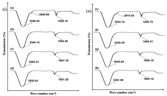 The study showed that fluidization of the skin occurred in the case of dermis. The fluidization occurred at 3380 cm−1 representing OH/NH functional groups. The fluidization of ceramides, keratin and lipids takes place at 2850–2930 cm−1. The study depicted that application of all patch formulations (Formulations F5 control, F5-E-Oil-5%, F5-NMP-5%, and F5-OA-10%) have affected the skin stratum corneum and have facilitated permeation of drug from the formulated transdermal patch formulations as showed in Figure 11ii [].