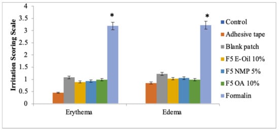 Skin irritation studies: erythema and edema. Data are expressed as mean ± SD; n = 3. One-way ANOVA followed by post hoc Tukey test; p < 0.05. (* p<0.05).