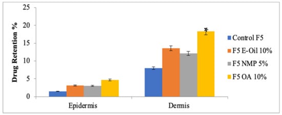 The study depicted that 10% of Oleic acid exhibited maximum drug permeation as compared to control formulation F5 (HPMC: Eudragit; 5:1) at 24 h, as showed in Figure 9c. The Oleic acid exhibited 8.5 times greater flux as compared to the control formulation F5 (p < 0.05). The study depicted that an increase in the concentration of Oleic acid is concentration dependent. The increase in the higher concentration of Oleic acid results in a higher amount of drug permeation. The transdermal drug delivery of lumiracoxib as a chemical enhancer has been evaluated and showed that 10% of Oleic acid showed maximum drug permeation for BCS Class-IV drugs. The result was in close agreement with our results [].