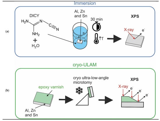For immersion testing, the sheets with an original size of 170 × 200 mm2 were cut into pieces with a size of 5 × 5 mm2. Pure DICY powder (Sigma-Aldrich, Vienna, Austria) was diluted in water up to a concentration of 3 wt% under stirring. Water was chosen as a solvent for DICY since it is also a component of waterborne epoxy coatings. Furthermore, to mimic the elevated temperature during curing, the solution was brought to boiling temperature and the metals were then immersed for 30 min, as schematically shown in Figure 1a. After immersion, the samples were rinsed with pure water and transferred to the XPS chamber after drying in air. As a reference, the same procedure was also carried out with pure boiling water.