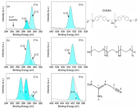 (a) C1s (left) and O1s (right) HR spectra of the epoxy resin, (b) C1s (left) and O1s (right) HR spectra of the emulsifier, and (c) C1s (left) and N1s (right) HR spectra of DICY.