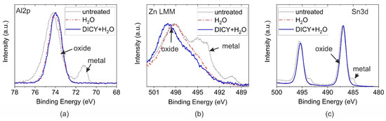 In Figure 3a–c, the XPS HR spectra of the corresponding metals are depicted before and after immersion in pure water and in the DICY–water solution. Since the chemical shift in the metallic and oxidic Zn was too small to be separated for the Zn2p peak, the LMM Auger signal was considered. For all metals, the treatment in pure water or in the solution of DICY in water resulted in an increase in the thickness of the oxide layer. The corresponding metal peaks were not discernible after immersion treatments. The respective oxide layer thicknesses exceeded the information depth of XPS. Moreover, the peak width and binding energy of the oxidic components of Al and Sn decreased slightly after immersion in the boiling liquids. Hence, a change in the chemical structure was indicated, associated with a hydroxylation of the oxide layers.