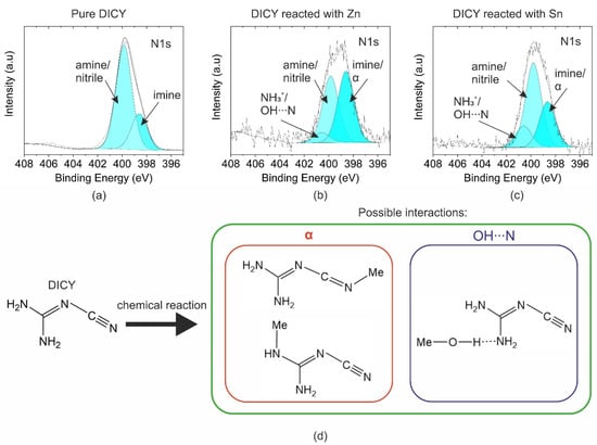 For Al, Zn, and Sn, chemical changes in DICY residues were observed due to boiling in the DICY–water solution. However, for Al the intensity of the N1s peak was very low (<0.6 at%). In contrast, the N content was 5.7 at% and 8.8 at% for the Zn substrate and the Sn substrate, respectively. N1s spectra of Zn and Sn metal sheets immersed in the DICY solution are depicted in Figure 4b,c. Comparing the spectra with the DICY reference (see Figure 4a), more symmetry was discernible for the DICY residues on the metal substrates. Moreover, the width of the peak had increased, most noticeably for DICY, which reacted with the Sn oxide layer. Hence, an additional peak was fitted at a higher binding energy. To ensure that the fit was consistent, the position and the full width at half maximum (FWHM) of the two peaks from the reference spectra were used. The additional peak at 400.6 eV can be either assigned to a protonated amine or a hydrogen bond with a metal hydroxide [11,18,21]. A similar interaction was proposed for DAE reacting with Zn oxide [11]. The hydroxide acts as a Brønsted acid. Additionally, the ratio between the two peaks of amine/nitrile and imine functionalities changed drastically. A new peak appeared with a binding energy comparable to that of the imine. This is presumably related to Lewis bonding of the metal ions to DICY, as already suggested for Al and Zn in [11,12,13]. The metal cation can either act as a Lewis base or acid. The binding energy of such a Lewis bond might lie between the imine and amine contributions. A value of 399.4 eV was reported for Zn reacted with amine [11]. Furthermore, a similar interaction could also be possible for the nitrile functionality of DICY, which may also form a Lewis bond with metal cations associated with similar binding energies [7]. The deconvolution of these peaks is difficult. Hence, the peak at 398.6 eV was assigned to the imine and the Lewis bond of DICY with metal cations, marked as the α state in Figure 4. The possible resulting products and interactions are depicted in Figure 4d.
