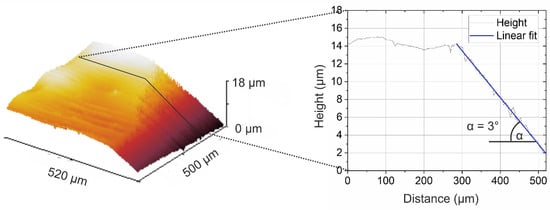 In Figure 6, the same ULAM cut is depicted as a 3D image acquired by white light interferometry. The original coating’s surface was wavy, and the thickness varied slightly. As evaluated from the linescan, the angle of the cut was 3.0°. During microtomy, the underlying metal substrate was cut or deformed, since the depth significantly exceeded the thickness of the coating, which was around 5 µm. Considering the obtained angle, the taper shown in Figure 5 is realistic and sufficient for obtaining several XPS linescan positions at a spot size of 150 µm.