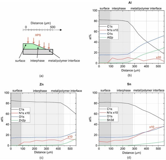 Immediately after ULAM-cutting, the samples were transferred to the XPS vacuum chamber. In Figure 7, XPS linescans over tapers of coated Al, Zn, and Sn are depicted. At an X-ray spot size of 150 µm, a step size of 50 µm was chosen for the scans. A clear difference in the elemental composition was obtained for the surface of the coating, the uncovered interphase, and the metal–polymer interface. For Al and Zn, the N content on the coating’s surface was below the detection limit. In contrast, N was detectable on the surface of the coating on the Sn. However, the content was slightly lower compared with the uncovered interphase. The low content of DICY on the coating’s surface is presumably related to segregation phenomena driven by differences in the size of DGEBA and DICY molecules [25]. Considering only epoxy and DICY, the nominal concentration of N should be 0.8 at%. Comparable values were measured in the interphase region of the coatings on the Al, Zn, and Sn.