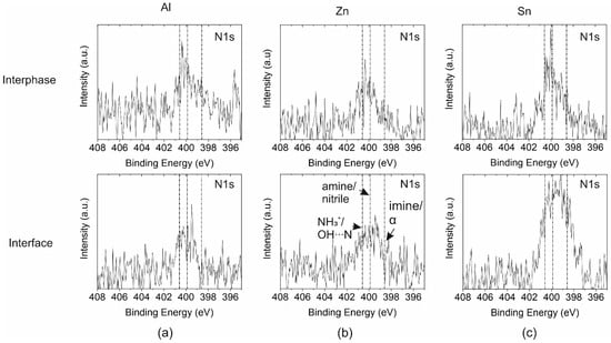 N1s peak in the interphase (i.e., the bulk of the epoxy coating) and at the epoxy–metal interface for (a) Al, (b) Zn, and (c) Sn.