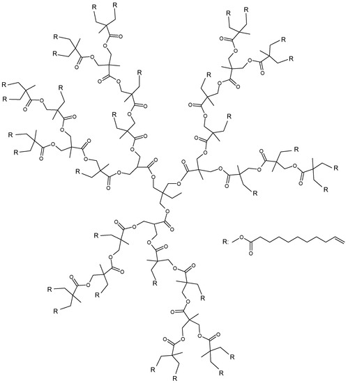 Perfectly branched dendrimers are suitable for applications in medicine as drug carrier molecules or in gene delivery, as standards or models for biomolecules, or as catalytic active molecules [7]. However, in the case of HBPs, the lack of a well-defined structure and molar mass is a disadvantage in these sensitive areas. In addition, their nature limits their application as bulk materials [11]. Nevertheless, HBPs have attracted substantial interest as a blend component, melt modifier, or additive due to their characteristics in numerous fields of applications, such as coatings, multifunctional crosslinkers, or surface modifiers [12,13,14].