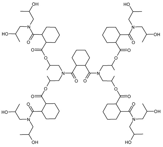 Foix et al. [53] studied the effect of different proportions of commercial hydroxyl-terminated HBP polyester Boltorn® H30 (Scheme 2) (Perstorp, Malmö, Sweden) on the curing process of epoxy/anhydride systems catalyzed with a tertiary amine. The addition of HBP clearly changed the shape of the curing exotherm in the non-isothermal calorimetry experiments (Mettler Toledo DSC 821e, Columbus, OH, USA), shifting the peaks to lower temperatures. However, DSC thermograms did not show many differences in shapes and temperatures when changing the proportions of HBP. The study of the conversion rate with temperature in the presence of hydroxylic-HBP revealed an acceleration of the curing process in the early stages in comparison with the neat epoxy/anhydride system. However, from the 80% of conversion, the HBP showed a retardant effect, and the complete curing was only achieved at high temperatures. Similar results were obtained with the commercially available hyperbranched poly(ester amide) Hybrane® S1200 and S2200 (Scheme 3) (Covestro, Leverkusen, Germany) [55,56]. In addition, increasing the proportion of ester groups in the thermosets improved their thermal reworkability by saponification.