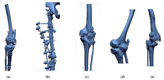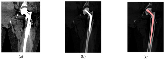 The digital data processing procedure was also used in the case of the occurrence of metallic structures within the analyzed bone tissues (Figure 6a,b). Thanks to the implementation of the shown procedure, it is possible to separate the implant from the bone tissue more efficiently (Figure 6c).