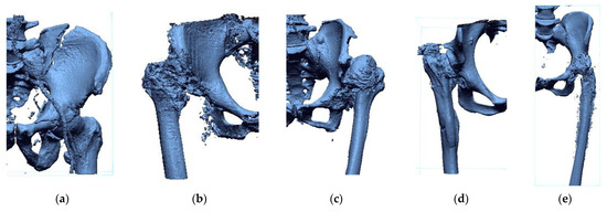 Cases of patients suffering from pathology of the hip joint: (a) Patient No. 6; (b) Patient No. 7; (c) Patient No. 8; (d) Patient No. 9; and (e) Patient No. 10.