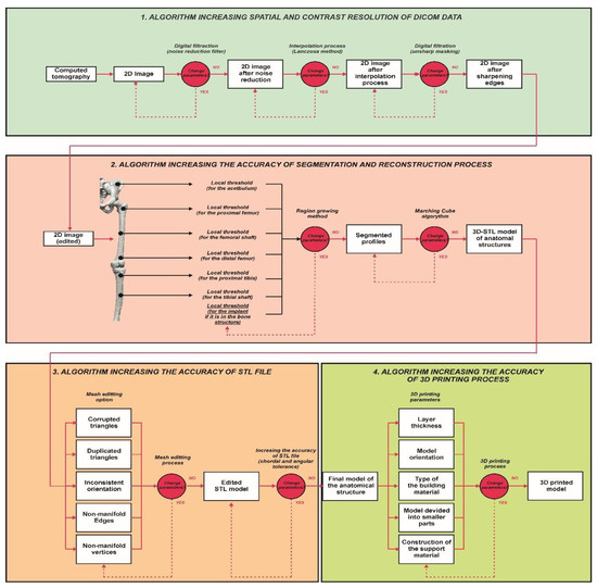 The accuracy of the anatomical structure model is influenced, by the type of diagnostic system used [11,12], data processing methods (taking into account the process of segmentation and reconstruction of geometry) [16,17], and the selection of a method and optimization of the manufacturing process [56,60,61,62]. Nowadays, a lot of research is conducted to assess the accuracy of the execution of anatomical structures. However, there is no systematic procedure for infrequently damaged bone structures and those which contain metallic structures. Considering the literature review, the quality of DICOM data is assessed based on spatial and contrast resolution [12,13]. They depend on the type of diagnostic system and the level of artifacts (especially metallic ones). The low diagnostic quality of DICOM data also impedes the segmentation process [7,8]. Thanks to the methodology used in the article, taking into account the digital filtration and data interpolation, the spatial and contrast resolution of the data was increased. This process improved the segmentation process of bone structures, including those that occur within metallic structures. Various types of segmentation algorithms can be found in the literature [10]. However, the thresholding option is still the most frequently used segmentation method [9]. However, as with any technique, it has some limitations, mainly due to difficulties with the correct selection of segmentation thresholds. The failure to establish the appropriate threshold or thresholds for segmentation may change the shape and volume of the reconstructed anatomical structure [7,8]. Thanks to the development of averaged values of local segmentation thresholds in the publication, it is possible to more reliably reproduce the geometry of the anatomical structure and the implant. At this stage of reconstruction of numerical anatomical models, it is necessary to properly prepare the digital data. Unfortunately, the algorithms that allow the reconstruction of anatomical structures in a three-dimensional form (e.g., planar contour or voxel-based methods) have certain limitations that affect the quality of the obtained faceted structure [11]. The faceted structure with errors makes it much more difficult to print the model directly, which, at the same time, extends the data processing time [40,41,42]. Thanks to the developed procedure, it is possible to efficiently remove the most common errors of the faceted structure arising in model geometry reconstruction from DICOM data, thus increasing the accuracy by interfering with the settings of the angular deviation and the chord. In addition, in the process of 3D-printing models, care was taken to select parameters that increase the manufacturing accuracy related to the layer thickness, the orientation of the model in the printer space, and the type of material. In the case of large-sized objects, dividing the model into parts was used. Considering the current literature review, a rapid increase in polymeric materials in the additive manufacturing of anatomical structures [56,61], also made of PLA material, can be observed [56,61,63,64]. There are also studies on the accuracy of anatomical structures made of this material [56,61]. Considering the publications [56,61], the models made of PLA material are within the tolerance of ±0.18 mm. In the case of the method presented in the manuscript, among other divisions into parts of the models, better accuracy of models was obtained in the case of the proximal femur, femoral shaft, and tibia shaft with a tolerance of ± 0.1 mm. Apart from further increasing the accuracy of the geometry printing, the purpose of this procedure was to reduce the printing time and thus the manufacturing costs.