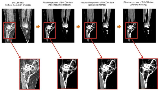 The Provincial Clinical Hospital No. 2 in Rzeszów performs a standard scanning protocol within the hip and knee joint area. Diagnostics were performed using a Discovery CT750HD multi-slice tomograph (GE Healthcare, Chicago, IL, USA). The obtained Digital Imaging and Communications in Medicine (DICOM) data had some limitations. Therefore, to minimize them, it was undertaken to develop a procedure at the stage of numerical data processing, which allows for increasing the spatial and contrast resolution of DICOM data. Digital data processing was used to improve the image quality, which, in the first stage, involved removing noise from the images (minimum noise reduction filter). A new digitally processed image was obtained by applying the filtration process. The filtering of digital images in the spatial domain was obtained using the convolution operation (multiplication of two frequency-domain transforms, i.e., the image and the filter transform, which is equivalent to the convolution of the image with the filter in the spatial domain). The convolution operation computed a new pixel value for the image based on the values of the adjacent pixels. The next stage of the procedure was to increase the spatial resolution of the image by using the interpolation method [37,38]. Image interpolation consists of determining additional pixels and their value based on the intensity of adjacent pixels. This is often referred to as image scaling, image resampling, or image resizing. Interpolation methods calculate missing pixel values from the data provided by the original image. To date, the disadvantage of this solution was the significant increase in the size of volumetric data, which required more memory and resources for rendering. Due to the substantial development of computerized systems, this problem no longer exists. The interpolation methods differ in determining additional pixels and their value. However, the resulting image will always be slightly blurred regardless of the interpolation method, so the filtration process was used at the last data processing stage. It sharpened the boundary between the bone structure and soft tissue (unsharpmasking filter). The entire data processing procedure is presented in Figure 5.