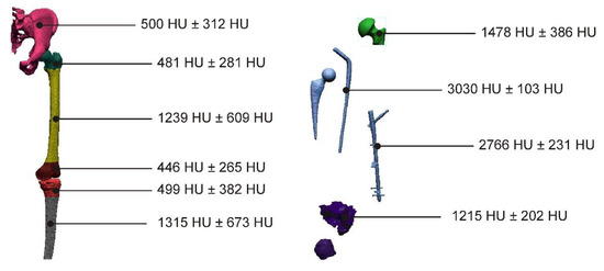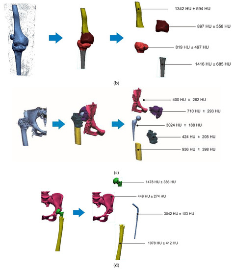 A segmentation process was performed on the digitally processed image. Thanks to the data processing process, the extraction of the bone structure was significantly accelerated with the simultaneous increase in the accuracy of geometry reconstruction. The segmentation process extracted an interesting operator anatomical structure from the entire data set. In segmenting the structures within the knee and hip joints, the region growing method was used. The local thresholding method was used to define the boundary conditions for this method, against which the bone structure was extracted. This procedure aimed to increase segmentation accuracy within the extracted bone structure by selecting an individual threshold in the designated area. Based on the averaged results obtained from the 10 analyzed patients, local segmentation thresholds for the bone structures within the hip and knee joints were developed. They were defined based on information on the averaged values of units in the HU scale assigned to pixels representing a given bone structure. The segmentation threshold values for metallic structures (Figure 7a,c,d) and the bone cement (Figure 7c) were determined. The effects of the implementation of the procedure in the context of planning a surgical procedure were presented for four selected patients of the proposed group (Figure 7a–d).