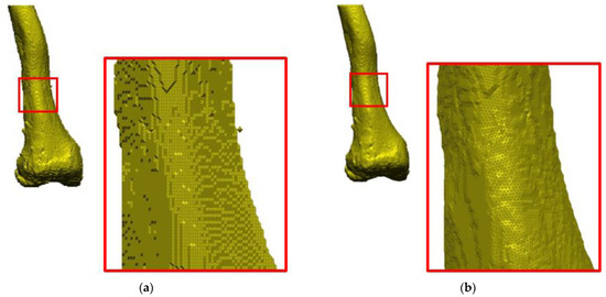 The most common error in the reconstructed geometry of anatomical structures concerns the direction of normal vectors, which should be directed outwards for all triangles. This is a prerequisite for the accurate description of the faceted surface. This error appeared on single fragments of the triangle mesh, selected areas, or the entire surface [41]. In saving the model to a format representing a triangle mesh, there were also mapping inaccuracies related to angular deviation or chord deviation [42,43]. Reducing the deviation of the chord and the angular deviation allows for an increase in the accuracy of mapping curvilinear surfaces. However, it should be remembered that if you want to reproduce the geometry as accurately as possible using a triangle mesh, it should be high densities. However, it is related to the enlargement of the file saved in the *.stl format. The size of the triangle mesh and its density on selected surfaces is closely related to the additive manufacturing method, which will be chosen at the following stages of the anatomical model. Densifying the mesh of triangles is sometimes necessary because the geometry of the anatomical models of the hip or knee joint structures is complex and consists mainly of curvilinear surfaces. In addition, the procedure includes the option of removing inclusions that are invisible during the export of data, which were created in the process of segmentation of the anatomical structure. They should be removed to increase the accuracy of the mapping of the model made in manufacturing processes.