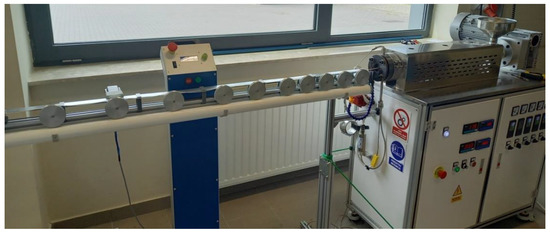 Composites in the form of granules were obtained using a twin-screw extruder. The process was performed in the temperature range of 210–230 °C, at a screw rotational speed of 400 RPM, reaching an extrusion capacity of 4 kg/h. The granules were seasoned for 24 h at room temperature. Filaments were produced from composites using the parameters in Table 2, using the technological line shown in Figure 9. Dumbbell-shaped samples for testing the strength and structural characteristics were manufactured using the Prusa i3 MK3. The process parameters are presented in Table 2.