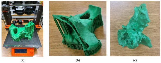 Figure 10a shows an exemplary model of the anatomical structure manufactured using unfilled PLA material, located in the working space of the Prusa i3 MK3 device, together with the supporting structure, after detaching from the working platform (Figure 10b) and after removing the supporting structure (Figure 10c).