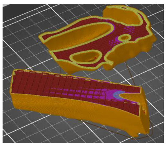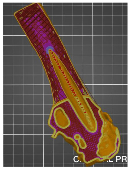 The additive FFF method used in the presented work and the device mentioned above allowed us to reduce costs and production time. It was possible thanks to taking into account a lot of factors during the printing. One of them was the division of the model into smaller parts—this procedure allowed for the printing of model fragments on separate devices with different production parameters. Additionally, when printing the models in the PrusaSlicer software, the height of the applied layer, density, filling, and the number of external contours were changed. However, it was noticed that the mentioned parameters in the case of adding modifiers for the entire model (Figure 11) or divided into fragments (Figure 12) might differ in the areas selected by the user. Figure 11 shows the use of the modifier for an undivided object representing the entire head and the shaft of the femur. In the case of the geometry presented in this way, the modifier allowed us to change the density, type of filling, number of strokes, and the type of the supporting structure. However, it was not possible to change the height of the superimposed print layer. In the case of the division of the femur into two separate parts representing the head and shaft of the femur (Figure 11), it was possible to change the abovementioned parameters, as well as the height of the print layer.
