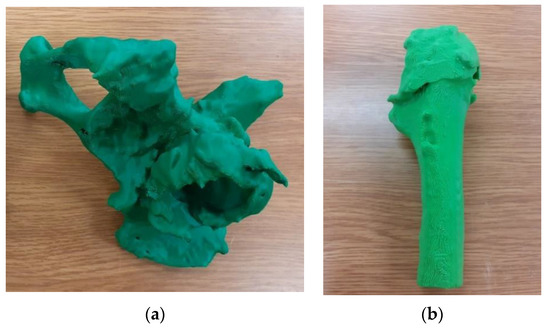 The second method was to divide both models into two separate parts reflecting the bone cement and pelvic bone (Figure 14a) and the head and shaft of the femur (Figure 14b), according to the procedure presented in this publication. In the case of dividing the model into parts, an increase in the accuracy of structures was observed. Additionally, the amount of material used during 3D printing was reduced.