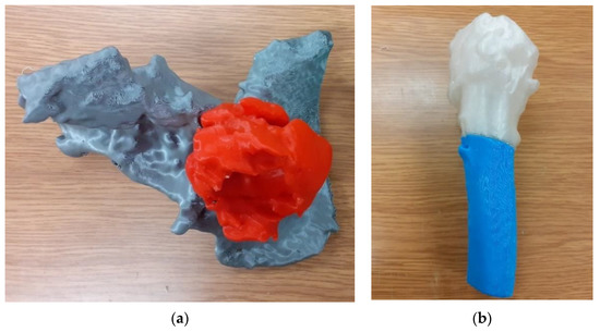 Thanks to the conclusion of a cooperation agreement, communication between the Department of Orthopaedics and Traumatology employees of the Provincial Clinical Hospital No. 2 in Rzeszów and the Rzeszów University of Technology was significantly improved. The obtained printouts of the models were used to plan surgical procedures. In the case of Patient No. 2, the printout of the model made it possible to assess the bone union and the spatial form of setting, and the strength of the callus connection of the multi-fragment fractures of the femoral shaft. Due to the lack of the distal femoral epiphysis, it was decided to insert a resection prosthesis with a custom-printed titanium extension of the femoral implant [65,66,67]. The situation with a coexisting shaft fracture at a distal femoral epiphyseal defect has not been described in the literature to date. Therefore, it required an innovative approach and an individual technical solution to this problem [68,69,70]. These actions allowed us, first of all, to shorten the time of immobilization and earlier commencement of rehabilitation to faster recovery of the flexion and extension movement functions in the knee joint. In the case of patients No. 7 and 10, due to the extensive loss of the acetabulum, an additional advantage of the printout was the ability to practice different versions and configurations of implants, which is essential in the case of such extensive pelvic defects, which give the operator virtually no margin of error. For this reason, such cases end up badly for the patient or require the use of special individual “custom made” implants. In addition to costs, they are also burdened with a high risk of complications and exhaust the options of surgical treatment, which is particularly important in young patients for whom good long-term functioning is vital. Thanks to the printed models in the operating room, it was possible to better visualize the anatomy visible in the operational area. In all the presented cases, the implants were successfully healed, improving the patient’s quality of life and giving them a chance for proper functioning. Thanks to the detailed, meticulous planning of the procedure, the type and position of the implants, and the length of their stabilizing screws, both the risk of failure and intraoperative complications were reduced. The time of procedures was shortened, and the need for mutilating procedures using post-resection prostheses was reduced. In the case of non-standard pathologies, e.g., covering extensive bone tissue defects, it is necessary to print a model showing the type and size of the pathology. The use of models allows for avoiding many unnecessary operational errors. However, it is required to conduct further research processes, which allow for the development of biodegradable materials [71,72,73] and reflect the structure and strength of human bone as accurately as possible [74,75], because the models presented in the article had a susceptibility to cutting and milling that was different from natural bone. When planning the procedure, the models presented in the article were made of classic polymer materials, for which it was difficult to perform efficient cuts and drilling due to their plastic deformation. On the other hand, the hybrid materials planned for development will have similar hardness and allow, as mentioned above, to obtain a structure identical to the natural human bone (hard and spongy part). Such obtained parameters of the artificial bone will enable the analysis of the course of the operation and non-invasive training as close to reality as possible.