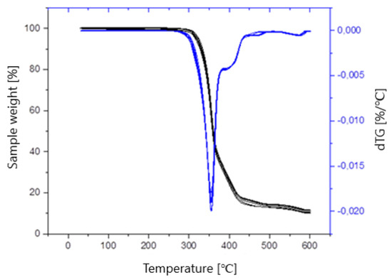 This means that the addition of both modified and unmodified hydroxyapatite slightly improves the material’s thermal resistance. The values of Tmax, i.e., the temperatures for which the value of the first derivative of the thermogravimetric curve reached the maximum, do not significantly differ, regardless of the degree of filling. The greatest percentage of weight loss corresponding to Tmax was observed in the case of unfilled material. The residue after the test, R600, slightly differs between the tested samples and has a higher value for composites than for unfilled PLA, except for composite V. The graph (Figure 17) shows a thermogravimetric curve showing the changes in the mass of samples of the obtained composites and unfilled material, depending on the temperature (black) and its first derivative (blue). Based on the analysis of the chart, it was found that the material was decomposed in one step, as evidenced by one maximum on the dTG curve.