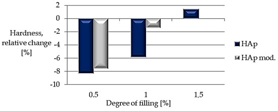 Based on the analysis of the results (Figure 18), no significant effect of the filler used was found. The greatest decrease in hardness (8.32%) was noted for the lowest filling, 0.5%. In comparison, for composites containing 1.5% of the filler, regardless of the filler’s use or lack of modification, the hardness of the material was close to the hardness value for the unfilled material.