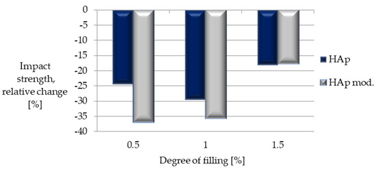A significant decrease in cracking resistance under dynamic loading was observed for all composites (Figure 19). For two of the three levels of filling tested (0.5 and 1%), the percentage of impact toughness decrease turned out to be higher for composites containing the modified filler.