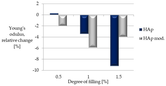 A significant reduction in the mass-melt flow rate with the unfilled material was observed for each composite. However, all samples were obtained using the parameters recommended by the manufacturer for unfilled PLA, without the need to raise the extrusion temperatures or the working table. Figure 16 shows the relative change in MFR for all composites with the unfilled material. The lowest decrease (26%) was recorded for the composite containing 1% of modified hydroxyapatite. At the same time, for the remaining cases, the values were similar, which shows that the modification of the filler does not have a significant impact on the mass flow rate of the composite produced with its participation.