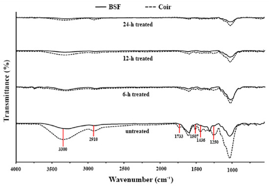 The treated natural fibers are shown in Figure 1, and their chemical functionalities are shown in Figure 2. The FTIR of both untreated BSF and coir showed characteristic peaks of cellulose, hemicellulose, and lignin. The absorption bands at 3300 and 2910 cm−1 indicate hydroxyl groups (–OH) and –CH stretching vibrations, respectively, from the chemical structures of cellulose and hemicellulose. The peak at 1733 cm−1 was attributed to C=O stretching vibrations of the acetyl group in the hemicelluloses. Adsorption at 1507, 1436, and 1250 cm−1 was attributed to C=C aromatic symmetrical stretching, HCH and OCH in plane bending vibrations, and C-O stretching vibrations of the acetyl groups, respectively, and these are typical absorption peaks of lignin [29]. After alkali treatment of BSF and coir, all absorption peaks decreased with treatment time. The absorption peaks around 1733–1250 cm−1 of both fibers disappeared after 24 h of treatment, indicating that lignin and hemicellulose might be removed, matching some previous reports [20,30,31,32].