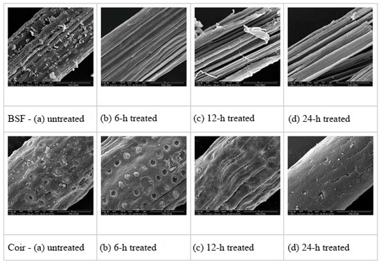 The surface topography of BSF and coir, both untreated and treated with 5% NaOH solution, was investigated, and the SEM micrographs are shown in Figure 3. The surfaces of untreated BSF and coir were not smooth, spread with nodes, and covered with irregular strips (Figure 3a) that may represent lignin, hemicellulose, or impurities [33]. After alkali treatment of both fibers for 6 h, the layer of substances on the fiber surface seemed to be removed (Figure 3b), matching the FTIR results indicating that lignin and hemicellulose contents were decreased. Some holes and rough surfaces were obviously observed, especially for coir fiber, that could improve the mechanical interlocking of the fiber and polymer matrix [33,34,35]. However, after alkali treatments for 12 or 24 h, the surfaces of the fibers had become smoother (Figure 3c,d), so that potentially, the interfacial bonding with the polymer matrix would be weaker than with the 6 h treatment of the fibers. It can be expected that the alkali treatment of fibers for longer than 6 h may cause damage by removing hemicelluloses, lignin, and bound cellulose from the fibers, which weakens the fiber strength [32]. Therefore, 6 h treated fiber was considered the most suitable for producing fiber-reinforced polymer composites, possibly having a good interfacial bonding with the polymer matrix and a desirable amount of cellulose exposed on the fiber surfaces.