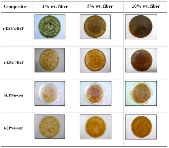Both untreated and treated coir and BSF were mixed with r-EPS at 2%, 5%, and 10% by total weight to obtain natural fiber-reinforced recycled EPS foam composites. Next, the composites were slowly poured to fill a 25 × 150 mm Petri dishes and then set aside to dry at room temperature in the fume hood. The mass of samples was measured and recorded until the constant mass was obtained within 72 h. With the ease of preparing the composites using these conditions, the solvent blend could be recovered for further use as a solvent for EPS recycling.