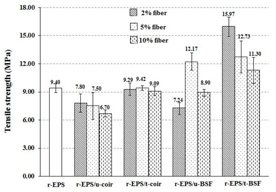 Tensile strengths of r-EPS composites with untreated and treated BSF or coir fibers at 2%, 5%, or 10% wt. loadings.