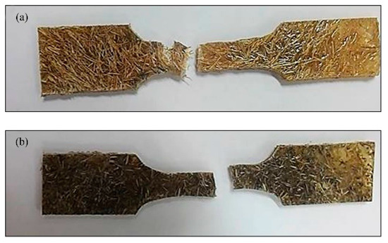Specimens after tensile testing: (a) r-EPS/5% t-coir, and (b) r-EPS/5% t-BSF.