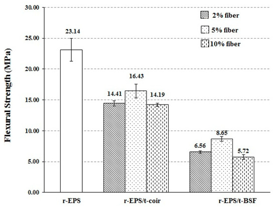 The flexural strength of treated BSF and coir reinforced r-EPS composites with different fiber loadings was evaluated by three-point bending flexural testing. The flexural strength of both the r-EPS/t-coir and r-EPS/t-BSF composites was smaller than that of the r-EPS (Figure 7), indicating that the natural fibers diminished bending resistance. This is possibly because the orientation of fibers may be at right angles to the direction of the force acting on them [49,50]. When compared with the tensile test discussed previously, the treated fibers added in the r-EPS enhanced the tensile strength of the material, as the pulling force is at right angles to the bending force, confirming the parallel arrangement of the fibers to the pulling direction, or the perpendicular arrangement to the bending direction. In addition, the flexural strength of r-EPS/t-coir was found to be greater than that of r-EPS/t-BSF at the same fiber loadings. This may be attributed to the fact that most of the treated coir in the composite was aligned in the direction of the bending force [47,51], more so than in the treated BSF. The flexural strength of the composites also increased as the fiber content increased from 2% to 5%, but it decreased to the lowest level for 10% of either treated fiber. This is likely due to the less uniform fiber distribution with greater fiber loading in the polymer matrix. Similar results were obtained for the tensile test, as described previously.