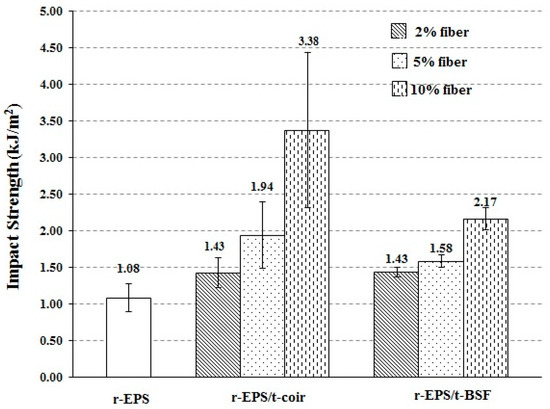 The impact strength of the composites was found to be increased from that of r-EPS (Figure 8), and it increased with the loading of treated fibers. Moreover, the r-EPS/t-coir composite showed higher impact strength than the r-EPS/t-BSF composite at the same loading. This indicates that the coir may absorb greater force during the impact test than the BSF. Since the coir is larger in size or lower in density than the BSF, the greater volume of the coir presents in the composite at the same mass added [41].