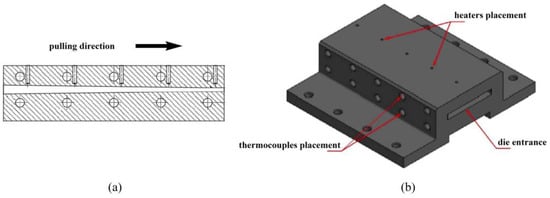 Diagram of the heated die block used to manufacture pultruded thermoplastic flat laminates of 75 mm × 3.5 mm: (a) cross section of the heated die block; (b) 3D model of the heated die block.