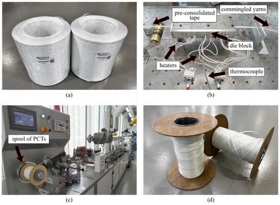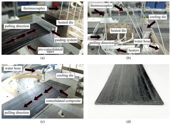 Pultrusion of thermoplastic flat GF/PP laminates based on commercial PCTs: (a) commercial PCTs entering the heated die; (b) die blocks during the pultrusion; (c) consolidated flat laminate leaving the cooling die block; (d) pultruded flat laminate.