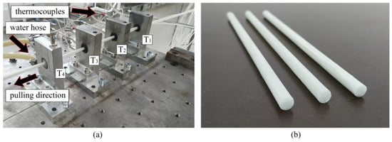 Pultrusion of thermoplastic Ø 6 mm GF/PP bars based on inhouse-made PCTs: (a) pultrusion process; (b) pultruded bars.