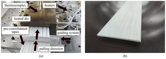 Pultrusion of thermoplastic flat GF/PP laminates based on inhouse-made PCTs: (a) inhouse-made PCTs entering the heated die; (b) pultruded flat laminate.