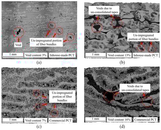Micrographs of PCTs: (a) inhouse-made PCT with the lowest void content of 2%; (b) inhouse-made PCT with the largest void content of 16%; (c) commercial PCT with the lowest void content of 7%; (d) commercial PCT with the largest void content of 17%.