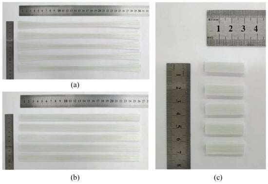 Mechanical test specimens machined from pultruded GF/PP flat laminates based on inhouse-made PCTs: (a) tension test specimens; (b) flexure test specimens; (c) short-beam shear test specimens.