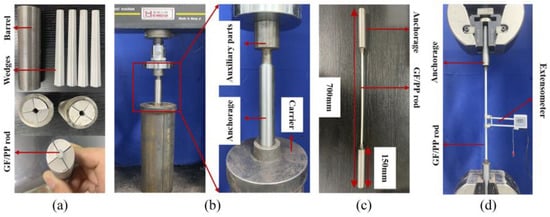 Test setup for tension testing of pultruded thermoplastic Ø 6mm GF/PP bars based on inhouse made PCTs: (a) anchorage design and assembly; (b) pre-tightening anchor; (c) anchored specimen; (d) tensile testing.