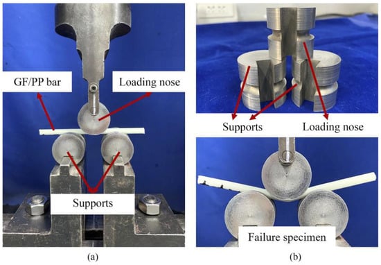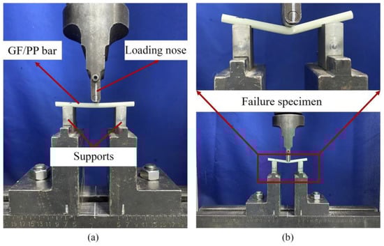 Test setup for short-beam shear testing of pultruded thermoplastic Ø 6 mm GF/PP bars based on inhouse-made PCTs: (a) short-beam shear testing; (b) failure specimen.