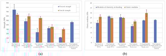 Mechanical properties of pultruded thermoplastic composites: (a) flexural and tensile strength; (b) modulus of elasticity in bending and elastic modulus.