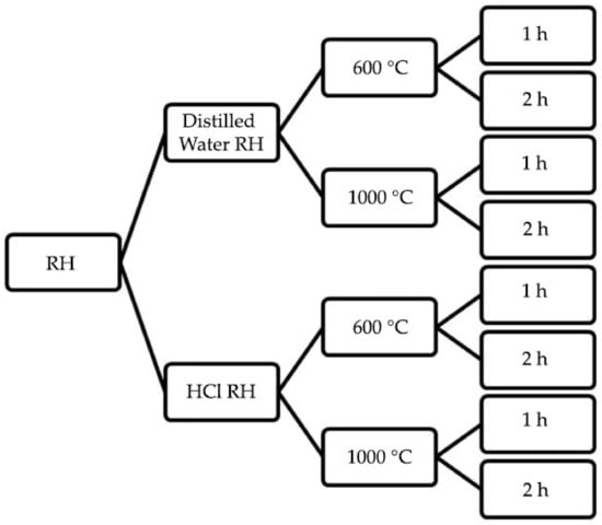 The second pre-treatment for RH is acid leaching using a 1M concentration of HCl. HCl that was used in this experimental work was purchased from Malay-Sino Chemical Industries (Perak, Malaysia). The optimum ratio that has been experimented with by other researchers revealed that 10 g of RH requires 100 mL, 1 M HCl solution []. A MR Hei-Standard (Heidolph, Illinois, USA) magnetic stirrer was used to heat the beaker. HCl solution was mixed with RH and stirred for thirty minutes once the temperature reached 60 °C. A thermometer was used to ensure the temperature was 60 °C throughout the process. Once the stirring process was completed, RHA was filtered using a standard stainless-steel mesh screen and washed with distilled water to remove any remaining HCl solution and solid residue. Then the RH was evenly distributed on an aluminum foil plate and dried in an open environment for 12 h. For the incineration process, a WiseTherm Digital Muffle Furnace (Daihan, Gangwon, Korea) was used for incinerating dried RH to RHA with a controlled temperature of 600 °C and 1000 °C for one and two hours, respectively.