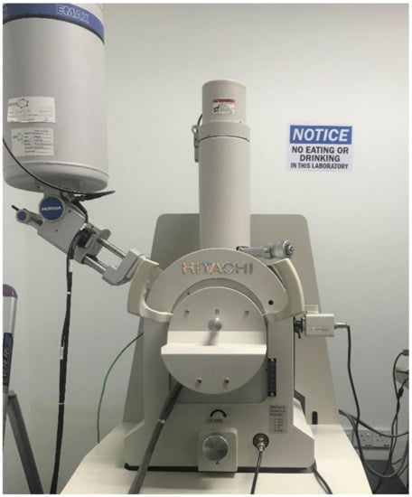 SEM is used to analyze the structure of RHA and the char layer of coating samples after the fire resistance test. The microstructure was outlined by exposing the surface structure of the material underneath a microscope with at least 25× magnification. SEM imaging was undertaken using a Hitachi S-3400 N (Hitachi, Tokyo, Japan) for the particle study and compound representation of the samples as shown in Figure 3. It was conducted at 15 kV. The importance of the SEM result is used to prove and support the information about the phase or structure of RHA conducted in the fire resistance test.